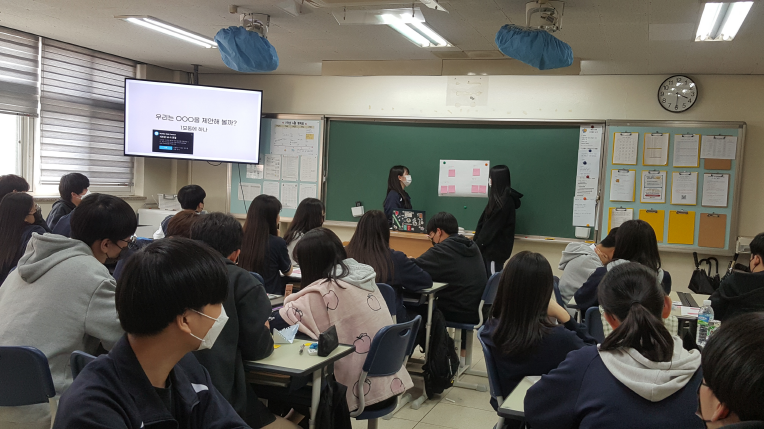 학생들이 3~4명씩 모둠으로 마을의제 발굴 토의 후 발표,사업게획서 작성의 순서로 진행